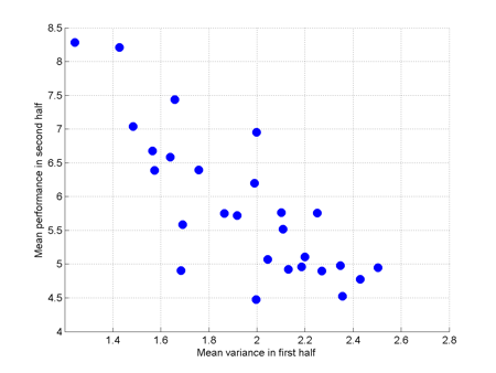 Normally we would expect people who perform best in the first half of a test to perform best in the second half (depressingly people who start out ahead usually stay there!). But this analysis showed up something interesting: a strong correlation between variability in the first half and performance in the second half. You can see this in the graph: