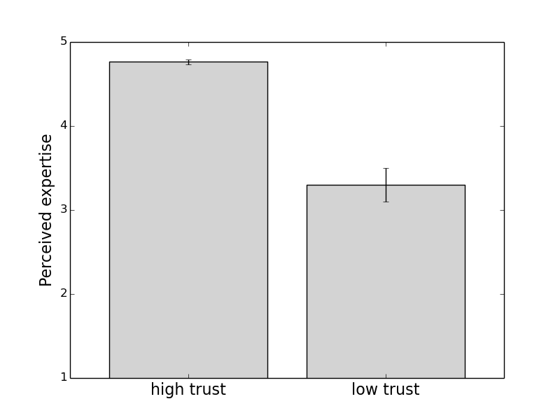 One way of making this clear is to pick out the people who have high trust in scientists (rating of 4 or 5), and compare them to people who have low trust (rating scientists a 1 or 2 for trust). The perceptions of their expertise differ, but not too much: