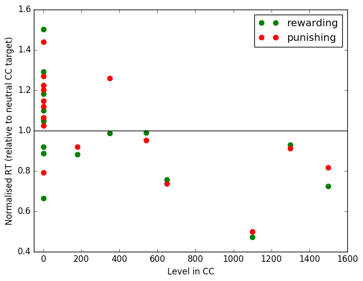 To illustrate how large the effect is, in the graph below I plotted each participant’s Candy Crush level, so 0 for non-players, against the ratio rewarding/punishing stimulus RT : neutral stimulus RT. Even with the small number of participants the effect is clear - Candy Crush players are faster for the value-relevant stimuli relative to neutral stimuli, non-players aren’t.