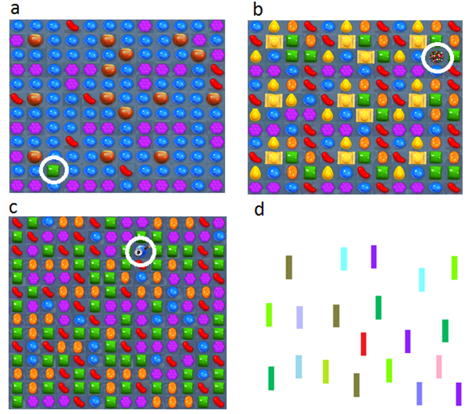 (b) Reward-associated containing a single multi-coloured bomb candy (circled) which is of positive consequences in the game.