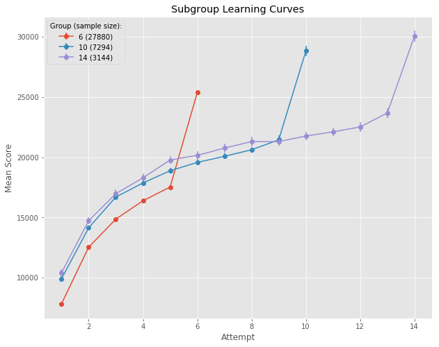 Normally I average over players who play different numbers of games, and in the average of performance against play attempt we see the typical learning curve - people get better quickly at first, then the rate of increase slows down.